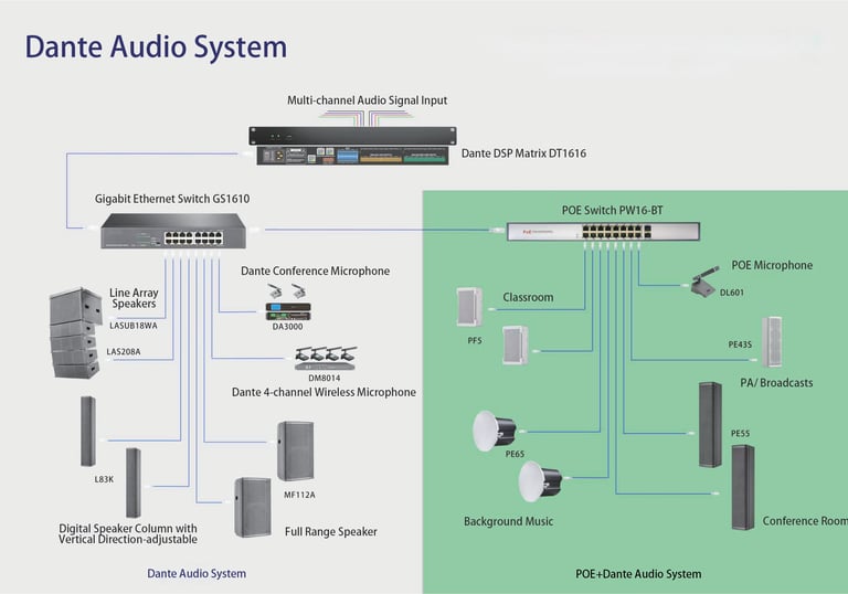 Integrated POE Dante systems for seamless audio networking and enhanced performance in professional environments.