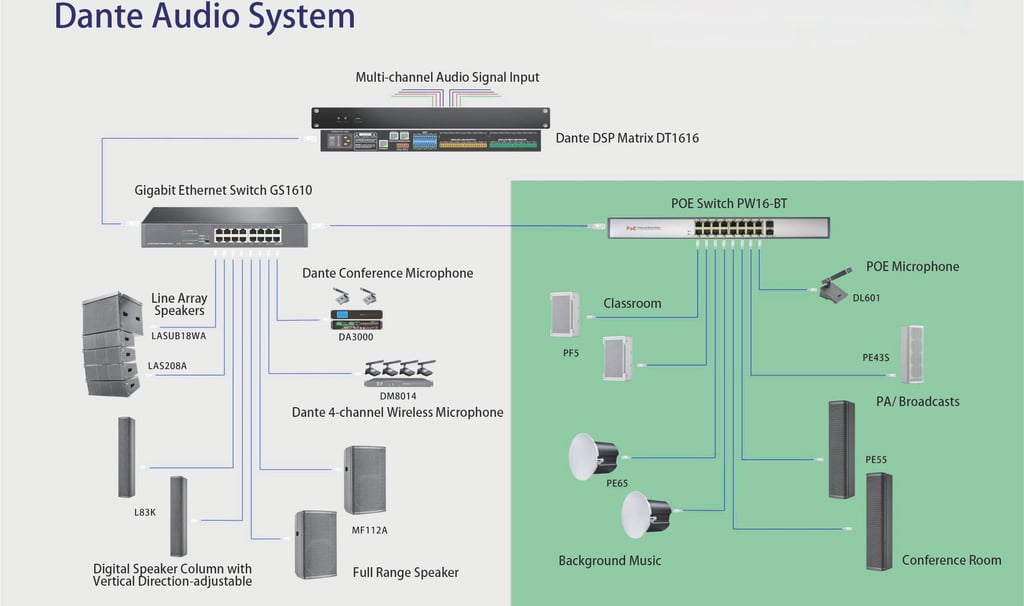 Unified AV Systems: Dante synchronizes microphones, speakers, video conferencing tools, and recording devices over a single network.